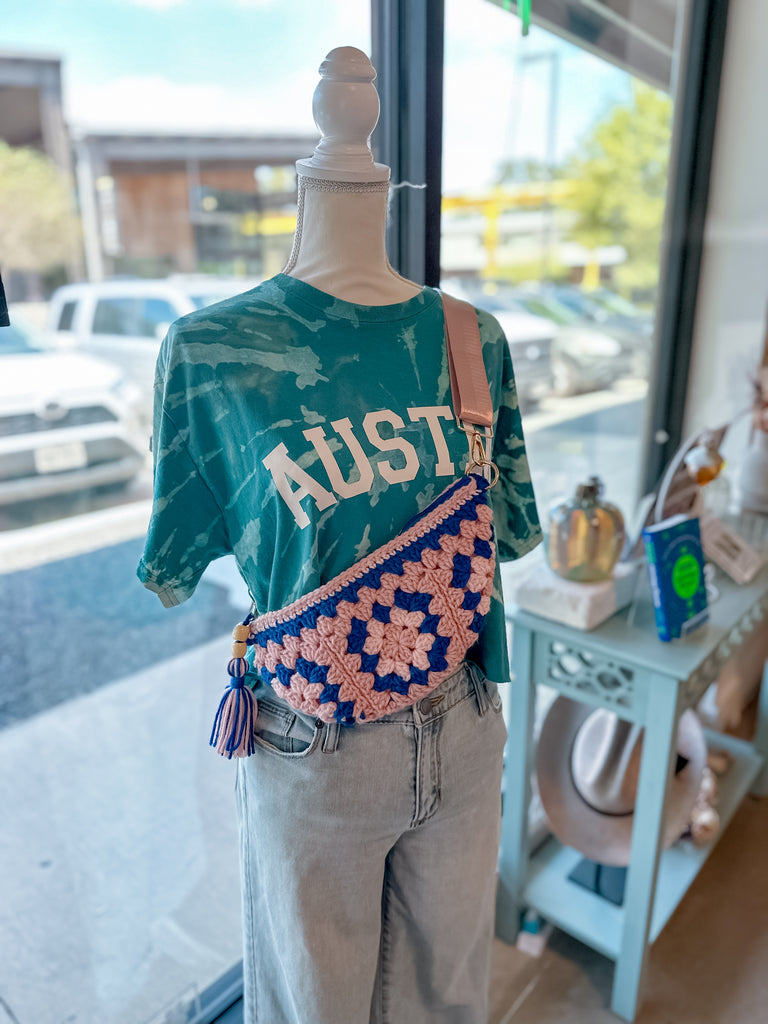 Light pink granny squares meet a bold blue accent for a sweet-meets-striking look. Finished with a pink polka-dotted liner and tassel, this crossbody brings playful retro charm to any outfit.